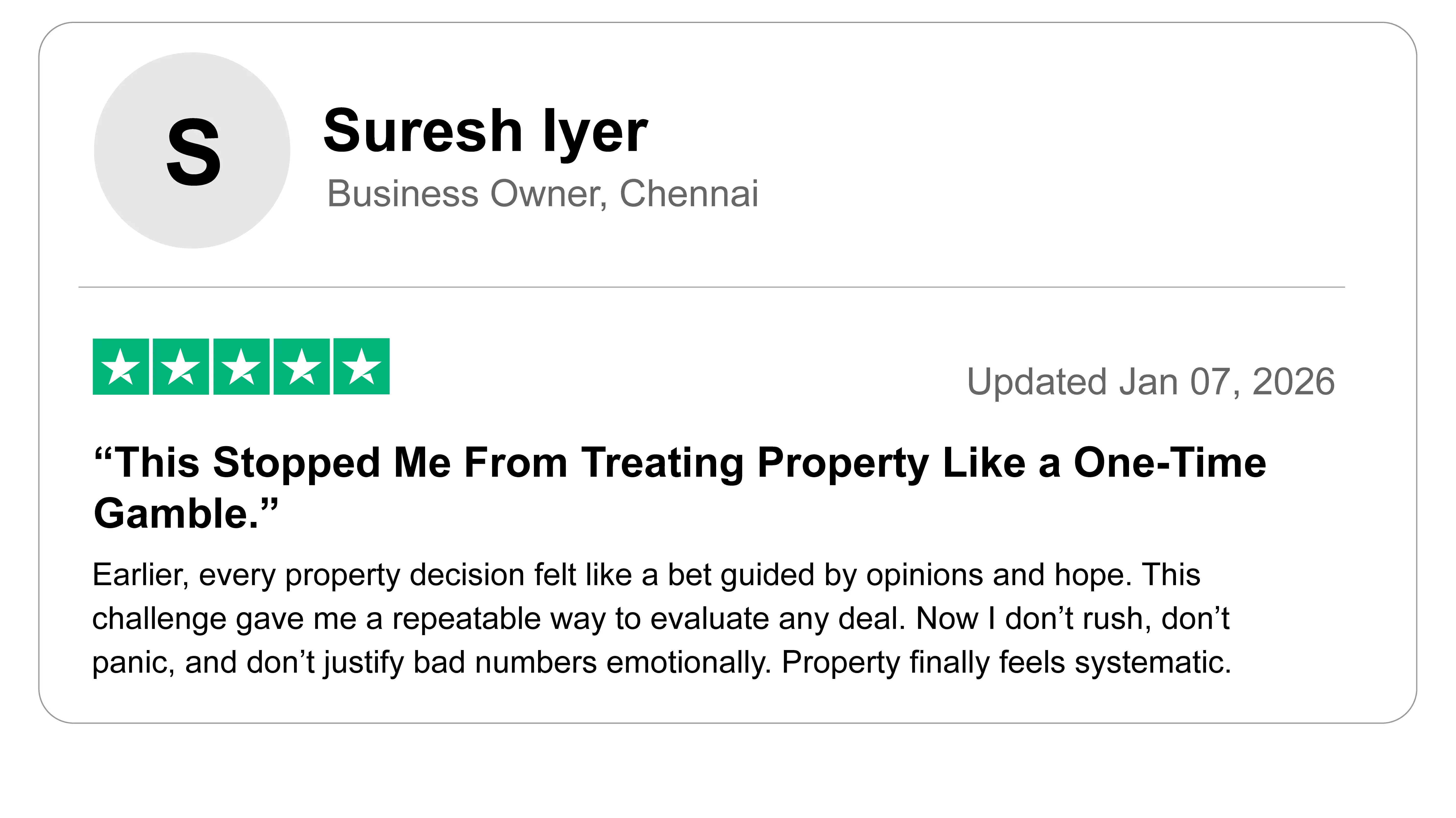 This is not motivation talk. You’ll see real Indian patterns of pricing games, traps and exits, and walk away with a simple Deal Logic you can reuse on any future property. So when the next broker, builder or “family friend” pitches you a deal, your brain isn’t blank - it’s already running checks in the background.